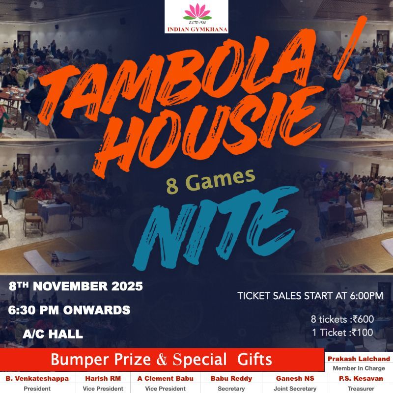 Tambola / Housie Night will commence from 6:00 PM on Saturday 8th November 2025. Rs.50,000 Cash Prize and Special Gifts.