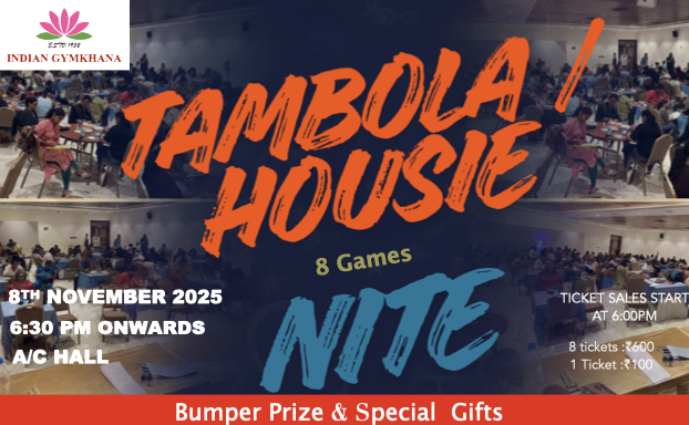 Tambola / Housie Night will commence from 6:00 PM on Saturday 8th November 2025. Rs.50,000 Cash Prize and Special Gifts.