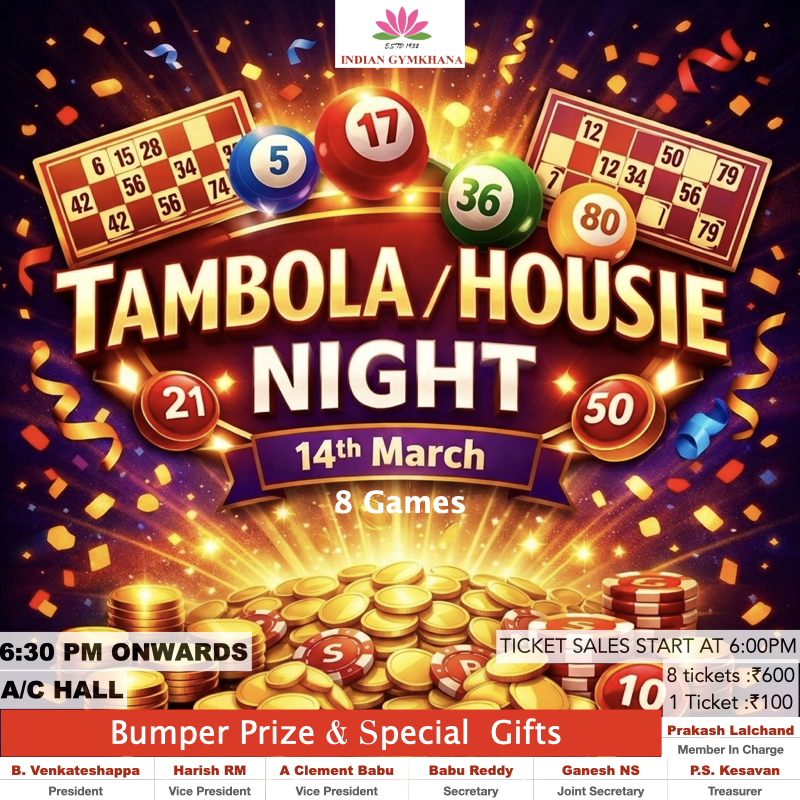 Tambola / Housie Night will commence from 6:00 PM on Saturday 14th March 2025. Rs.50,000 Cash Prize and Special Gifts.